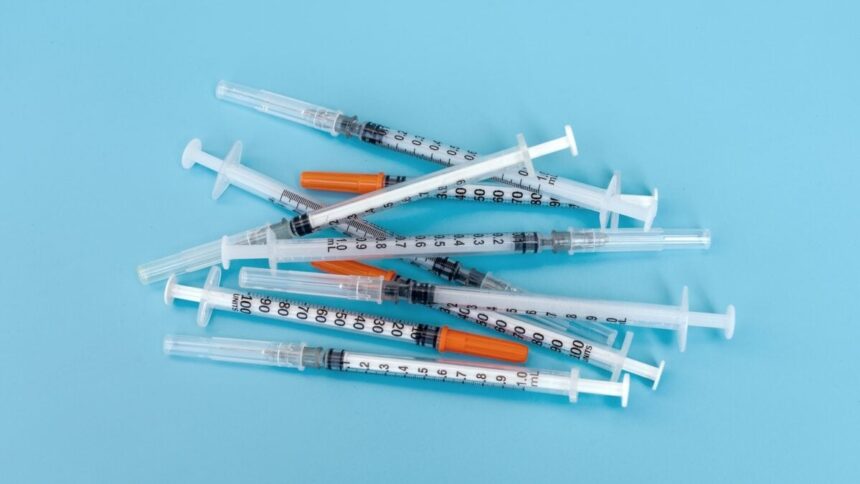 All you really need to see to process what’s happening is one photo from the article by Jason Henry. It’s a picture taken at a “peptide rave” in San Francisco featuring a guy in a white lab coat and black boots, with a familiar orange and white syringe in his hand, demoing the process, familiar to all heroin addicts, of turning a powder into an injectable liquid. His audience is a small crowd of blurry people with White Claw cans in their hands. There’s a piece of printer paper on a table at his demo station with a QR code on it and the word “WAIVER.”