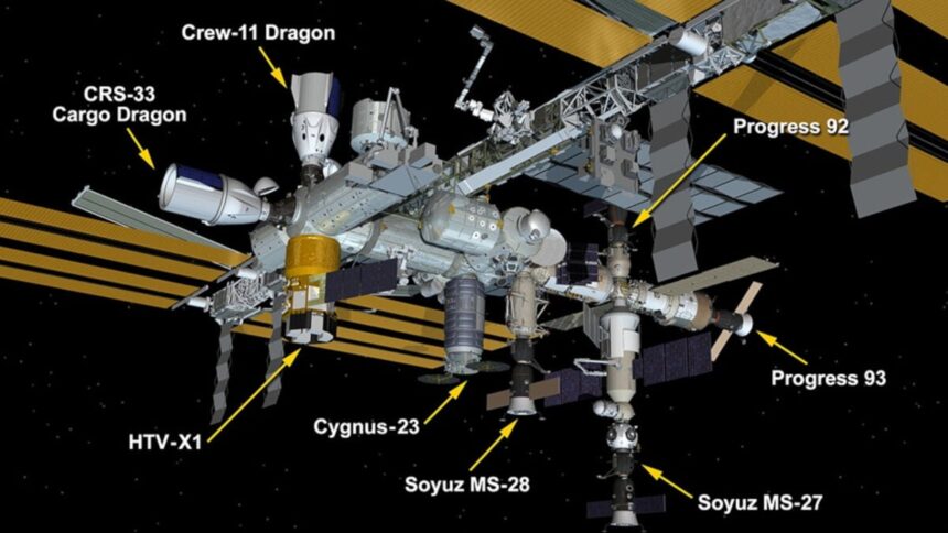 The eight spacecraft currently docked to the ISS are: two SpaceX Dragon vehicles, Cygnus XL, JAXA’s (Japan Aerospace Exploration Agency) HTV-X1, two Roscosmos Soyuz crew spacecraft, and two Progress cargo ships.